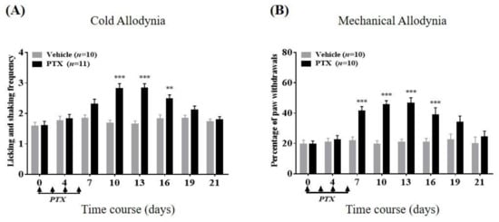 Change over time in repeated paclitaxel (PTX) treatment-induced cold (A) and mechanical (B) allodynia in mice. On days 0, 2, 4, and 6 (4 arrows), PTX or vehicle was administered (i.p.). Mice were subjected to measurement of allodynia just before and between day 4 to day 21 after the first dose of PTX (on the timeline: days 0, 4, 7, 10, 13, 16, 19, and 21, respectively). In the acetone test, the number of licking and shaking motions in 30 s were counted. In the von Frey assay, the percentage was used to express the result: (number of tests accompanied by withdrawals) × 100/(number of total tests). Data are expressed as mean ± S.E.M.; ** p < 0.01, *** p < 0.001, vs. vehicle by Bonferroni post-test after two-way analysis of variance (ANOVA).