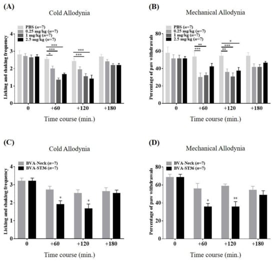 To verify the anti-allodynic effects of BVA on paclitaxel-induced peripheral neuropathy, three different doses of BV or vehicle (PBS) were injected subcutaneously at ST36 of mice showing symptoms of hypersensitivity (days 10–16; 0.25, 1.0, and 2.5 mg/kg; s.c.). In terms of cold allodynia, 1.0 and 2.5 mg/kg BV ameliorated the acetone-elicited withdrawal frequency, lasting for 120 min (Figure 2A). The lowest dose BV (0.25 mg/kg) alleviated cold hypersensitivity only at the 60 min time point. In the von Frey test, compared to the PBS-treated mice, the low and medium BVA treatment groups (0.25 and 1.0 mg/kg) showed a markedly decreased withdrawal percentage of the hind paw at 60 min and 120 min (0.25 mg/kg: 60 min, p < 0.001; 120 min, p < 0.01 and 1.0 mg/kg: 60 min, p < 0.01; 120 min, p < 0.001. Figure 2B). However, the highest dose group (2.5 mg/kg) showed a similar effect only at the 120 min time point. These results clearly demonstrate that BVA treatment ameliorates cold and mechanical allodynia generated by paclitaxel, for which the optimum dosage is 1.0 mg/kg. Next, Figure 2C,D evaluated the effect of 1.0 mg/kg of BVA at ST36 (BVA-ST36) versus the neck, a different body area (BVA-Neck), on cold and mechanical measurements. At the 60 and 120 min points, significant differences were observed between the BVA-ST36 and BVA-Neck groups in both behavioral assessments. Thus, mice dosed with BV directly on the ST36 acupoint showed a more favorable analgesic effect than that produced by neck area administration on paclitaxel-induced allodynia.