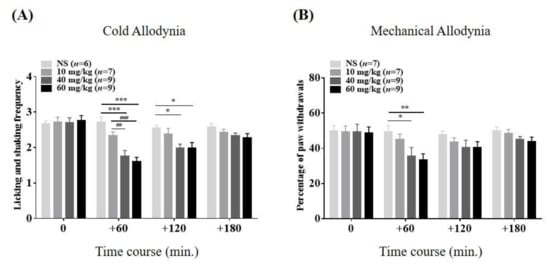 Time course of the relieving effects of venlafaxine (VLX) on paclitaxel-induced cold (A) and mechanical (B) allodynia in mice. Mice were assigned arbitrarily into four groups. “10,” “40,” and “60 mg/kg” refer to the doses of VLX treatment. Both measurements were performed four times; just before the injection of VLX and at 60-min intervals for 3 h after treatment (on the timeline: 0, 60, 120, and 180, respectively). Data are expressed as mean ± S.E.M.; * p < 0.05, ** p < 0.01, *** p < 0.001, vs. control (NS); ## p < 0.01, ### p < 0.001, vs. 10 mg/kg VLX group by Bonferroni post-hoc test after two-way ANOVA.