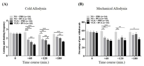 In a separate cohort of mice, the combined effects of a medium dose of BVA and VLX on cold and mechanical allodynia elicited by paclitaxel were examined. In the combination strategy group (VLX + BVA), mice in allodynic states underwent BVA (1 mg/kg, s.c.) and VLX (40 mg/kg, i.p.) administration simultaneously. As expected, in each assessment (Figure 4A,B), compared to the vehicle-treated (NS + PBS) mice, the analgesic actions of the monotherapy group (e.g., NS + BVA and VLX + PBS) lasted only for 120 min. On the other hand, the co-treatment strategy significantly reduced licking and shaking frequencies (cold allodynia) and the percentage of hind paw withdrawal (mechanical allodynia) until the 180 min point. It was also apparent that combination therapy showed markedly greater inhibitory effects than both monotherapy groups at the 120 min point in the acetone test. Thus, our data indicate that co-administration of BVA at 1.0 mg/kg and VLX at 40 mg/kg fully mitigates the paclitaxel-elicited cold and mechanical hypersensitivity, suggesting longer-lasting and additive effects over other monotherapy groups.