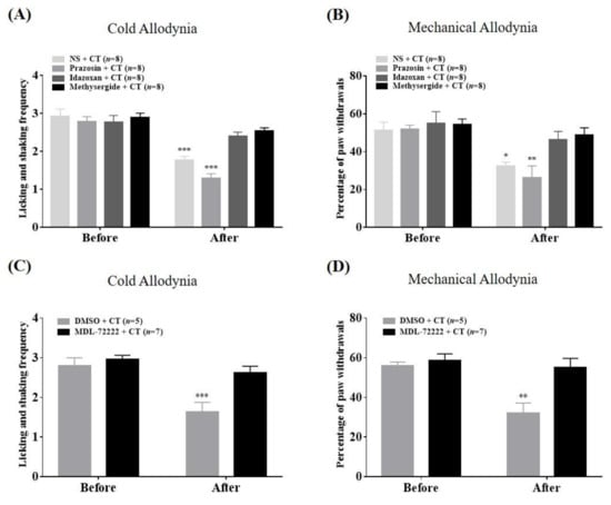 To examine the analgesic mechanism of combination therapy against cold (Figure 5A,C) and mechanical (Figure 5B,D) allodynia at the spinal level, four types of α-adrenergic and 5-HT receptor antagonists were administered intrathecally (i.t.) 20 min before combination treatment (BVA, 1 mg/kg, s.c.; VLX, 40 mg/kg, i.p.). Pretreatment with each appropriate vehicle (NS and 20% DMSO, respectively) or α1-adrenergic receptor antagonist, prazosin, did not alter the analgesia from combination treatment (p > 0.05). However, mice pre-administered other antagonists (idazoxan, methysergide, MDL-72222) demonstrated no anti-allodynic effect of combination therapy. In other words, spinal α2-AR, 5-HT1, 5-HT2, and 5-HT3 receptors, but not the α1-AR subtype, mediate the analgesic effects of co-administered BVA and VLX on cold and mechanical allodynia generated by paclitaxel.
