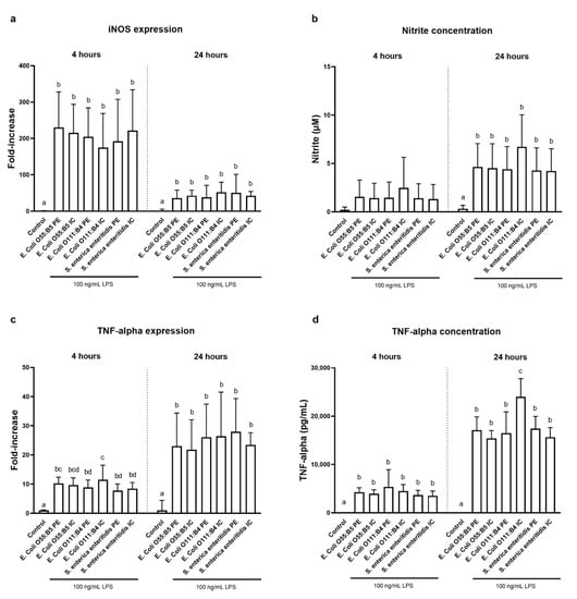 Gene expression of inducible nitric oxide synthase (iNOS) (a), nitrite concentration (µM) (b), gene expression of tumor necrosis factor alpha (TNF-alpha) (c), and TNF-alpha concentration (d) of RAW cells stimulated with 100 ng/mL lipopolysaccharides (LPS) of two different Escherichia coli (E. coli) strains (O55:B5, O111:B4) and one Salmonella enteritica enteritidis (S. enteritica enteritidis) strain either phenol extracted (PE) or phenol extracted and purified with ion-exchange chromatography (IC) for 4 h or 24 h (n = 6). Values represent mean values with standard deviation. abcd Superscripts indicate significant difference within treatment at each timepoint (p < 0.05).