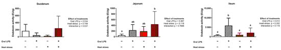 Endotoxin activity (EU/g) in the (a) duodenum, (b) jejunum, and (c) ileum of broilers kept either under thermoneutral conditions (10 h, 23 °C) or under heat stress conditions (10 h, 36 °C) receiving an oral dose of saline (0.9%; no LPS) or LPS (1 × 2 mg/kg b.w.). n = 8 animals/treatment. Values present means with standard deviation. − indicates no treatment, + indicates treatment. ab Superscripts indicate significant difference (p < 0.05).