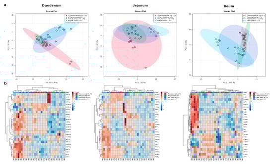 Principal component analysis (PCA) plots (a) and heat maps (b) of the expression of all measured genes in the duodenum, jejunum, and ileum of broiler either kept under thermoneutral conditions (10 h, 23 °C) or kept under heat stress conditions (10 h, 36 °C) receiving an oral dose of saline (0.9%; no LPS) or LPS (1 × 2 mg/kg b.w.). n = 8 animals/treatment.