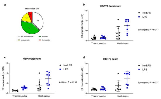 Summary of the number of interactions in the gastrointestinal tract (GIT) (a). Interactions of treatment factors on the delta Ct values of heat shock protein 70 (HSP70) in the duodenum (b), jejunum (c), and ileum (d) of broilers either kept under thermoneutral conditions (10 h, 23 °C) or kept under heat stress conditions (10 h, 36 °C) receiving an oral dose of saline (0.9%; no LPS) or LPS (1 × 2 mg/kg b.w.). n = 8 animals/treatment. Values present means with standard deviation.