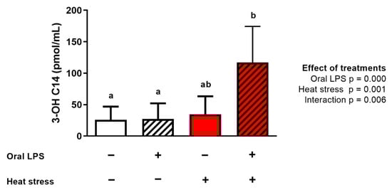 The 3-OH C14 concentration in the serum was significantly increased in heat stressed animals receiving LPS compared with both thermoneutral groups. The fold-change in comparison with the thermoneutral group receiving no LPS (4.5-fold) and thermoneutral group receiving LPS (4.3-fold) was similar (Figure 5). Overall, LPS administration, heat stress, as well as the interaction of both factors had a significant influence on the 3-OH C14 concentration. The effect of the treatments was synergistic. There was no effect of any treatment on the alpha-1-acid glycoprotein, ceruloplasmin, and serum amyloid A concentration in the serum (Table 5).
