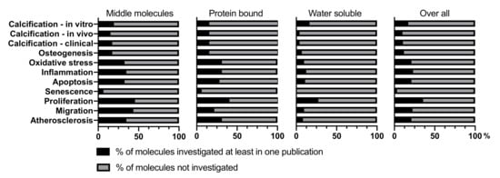 PBURM are a heterogenous group of solutes, characterized by reversible protein binding capacity. PBURM are considered a major threat to ESRD patients, partly because of their limited removal by conventional dialysis [30]. Of the 32 PBURM included in this review 5 (15.6) have been investigated with respect to effects on VC. A summary of their effects on VSMC calcification is given in Table 3 (Supplementary Table S2).