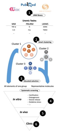 Outline of a systematic screening approach for uremic retention molecules (URM). 1. URM need to be collected and organized in a library, possibly starting with the European Uremic Toxin Work Group’s database, extended by recent discoveries. 2. URM need to be logically sorted into smaller, accessible groups. Clustering strategies could be based on chemical similarity, origin, or others. 3. A selection for actual testing needs to be applied which could be by, educated guessing based on known effects, testing the representative molecule from each cluster to identify relevant subgroups or by testing cluster wise. 4. Selected molecules are tested systematically in on one or more cell types for relevant effects like calcification, inflammation, apoptosis, etc. … in vitro, 5. If successful in vivo and 6. On a clinical level.