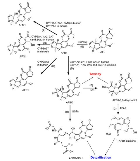 The major metabolic pathways of aflatoxin B1 (AFB1): (A) Aflatoxin M1 (AFM1) and (B) aflatoxin Q1 (AFQ1) by hydroxylation; (C) Aflatoxin P1 (AFP1) by demethylation; (D) AFB1–8,9-epoxide (AFBO) by epoxidation; (E) Aflatoxicol (AFL) by ketoreduction; (F) AFB1-8,9-dihydrodiol by microsomal epoxide hydrolase (mEH); (G) AFB1-dialcohol by aflatoxin-aldehyde reductase (AFAR); and (H) AFBO-glutathione (AFBO-GSH) by conjugation with glutathione. CYP: Cytochrome P; GSTs: Glutathione S-transferases [123].