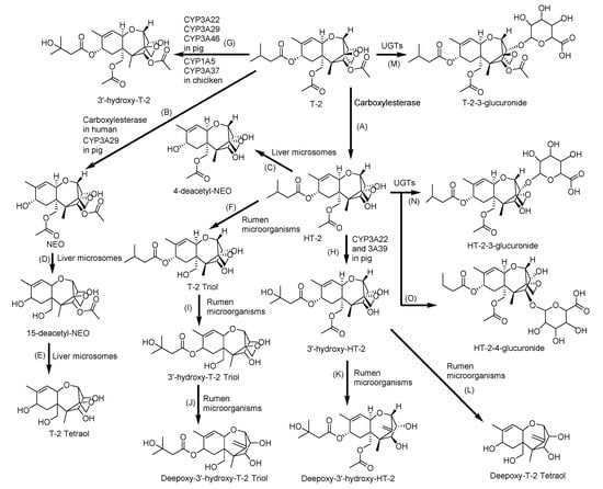 Metabolic pathway of T-2 toxin (T-2): (A) HT-2 toxin (HT-2), (B) Neosolaniol (NEO), (C) 4-deacetyl-NEO, (D) 15-deacetyl-NEO, (E) T-2 triol and (F) T-2 tetraol by hydrolysis; (G) 3′-hydroxy-T-2, (H) 3′-hydroxy-HT-2 and (I) 3′-hydroxy-T-2 triol by hydroxylation; (J) Deepoxy 3′-hydroxy-T-2 triol, (K) Deepoxy-3′-hydroxy-HT-2; (L) Deeopoxy-T-2 Tetraol by deepoxiadtion; and (M) T-2-3-glucuronide, (N) HT-2-3-glucuronide, and (O) HT-2-4-glucuronide by conjugation with glucuronic acid. UGTs: Uridine 5′-diphospho-glucuronosyltransferases [154].