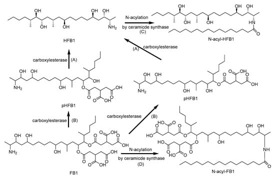 Metabolic pathway of fumonisin B1 (FB1): (A) Aminopentol (HFB1) and (B) partially hydrolyzed FB1 (pHFB1) by hydrolysis; (C) N-acyl-HFB1 and (D) N-acyl-FB1 by N-acylation [161,162,163].
