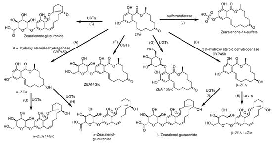 Metabolic pathway of zearalenone (ZEA): (A) α- zearalenol (B) (α-ZEA) and β- zearalenol (β-ZEA) by hydroxylation; (C) Zearalenone-glucuronide, (D) α-zearalenol-glucuronide and (E) β-zearalenol-glucuronide by glucuronidation; (F) Zearalenone-14-glucoside (ZEA14Glc), (G) Zearalenone-16-glucoside (ZEA16Glc), (H) α- zearalenol-14-glycoside and (I) β-zearalenol-14-glucoside by glycosidation; and (J) Zearalenone-14-sulfate by sulfation. UGTs: Uridine 5′-diphospho-glucuronosyltransferases [170].