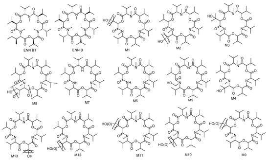 For ENNs, the most information is currently available for ENN B and B1. In vitro and in vivo studies demonstrated that CYP3A4, CYP2C19, and CYP1A2 play the major role for ENN B metabolism in human microsomes and CYP3A and CYP1A are also included in this process in rats and dogs [109]. The 12 biotransformation products were characterized after the incubation of ENN B with rat, dog, and human liver microsomes (Figure 8): M1–M5 were monohydroxylated and M6 and M7 were N-demethylated, whereas M8–M12 were the result of multiple oxidations [110]. However, only eight metabolites could be detected in the case of chicken liver microsomes, particularly five hydroxylated (M1–M5) and three carboxylated (M9, M11 and M12) metabolites. Moreover, M4 and M13 were major metabolites in egg samples, while M11 and M13 were found in liver and serum samples collected after broilers and hens were given contaminated feed containing ENN B [111]. Similarly, ENN B1 is mainly metabolized by CYP3A4 [112]. In vitro incubation with minipig and slaughter swine liver microsomes resulted in the detection of ten ENN B1 metabolites (M2–M11) and M1 occurred only in the minipig assays, while six metabolites (M5–M8) were detected also in vivo [113]. Rumen microbiota also proved to be able to degrade ENN B up to 72% after 48 h of incubation [114]. Any sulfated or glucuronidated phase II metabolites of ENN B or ENN B1 were detected (Figure 9) [115].