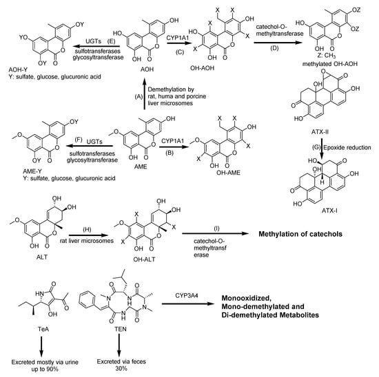 Biotransformation pathway of Alternaria mycotoxins: Alternariol (AOH), alternariol monomethyl ether (AME), hydroxy-alternariol (OH-AOH), hydroxy-alternariol monomethyl ether (OH-AME), tenuazonic acid (TeA), altertoxins (ATXs), Tentoxin (TEN), altenuene (ALT), hydroxyl-altenuene (OH-ALT). (A): Demethylation; (B,C,H): Hydroxylation; (D,I): Methylation; (E,F): Sulfation, glycosylation, and glucuronidation; (G): Epoxide reduction. CYP: Cytochrome P; and UGTs: Uridine 5′-diphospho-glucuronosyltransferase [71,117,121,172,173,174,177,178,179,180,181].
