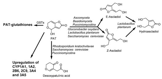 PAT induces the upregulation of PXR and AhR accompanied by the enhancement of CYP1A1, CYP1A2, CYP2B6, CYP2C9, CYP 3A4, and CYP3A5 expression [130]. Moreover, PAT reacts with intracellular glutathione in gastrointestinal mucosa cells [182,183]. The extracellular enzymes of Lactobacillus casei YZU01 induced by PAT mainly degrades PAT, and the cell wall of this bacteria can also absorb a small amount of PAT [184]. Similarly, the degradation of PAT was observed by Saccharomyces cerevisiae during cider fermentation into E-ascladiol and Z-ascladiol (Figure 12), which are not toxic to human [185]. The biotransformation of PAT in humans and animals is not well understood and remains to be established.