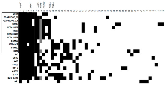 The predicted toxin–antitoxin (TA) systems in S. maltophilia genomes. The genomes with names bracketed in black rectangle were isolated from clinical sources. Black squares indicate the presence of a TA system, whereas grey squares indicate the presence of a pseudogene version. The information about the presented TA systems (1–49) is described in Table S1. TA systems analyzed in this work are indicated above.