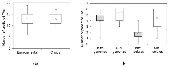 As can be seen from Figure 1, there were no clear TA distribution patterns characteristic to annotated genomes of S. maltophilia from clinical or environmental origins. The average number of predicted TA systems per genome did not significantly differ between the S. maltophilia of both origins (Figure 2a).