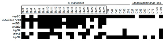 The prevalence of predicted TA systems in Stenotrophomonas spp. of clinical and environmental origins. The isolates with their names bracketed in black rectangles were derived from clinical sources. The presence of TAs, indicated as black boxes, was detected by PCR as described in the Materials and Methods section.