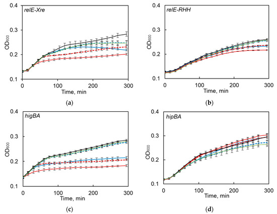 The kill-rescue assay was performed as described previously [86]. Briefly, E. coli BW25113 F‘ strains harboring plasmids pBAD_tox and pUHEcat_antitox were grown overnight, diluted 1:500 into fresh medium supplemented with 0.2% glucose, and grown to its early exponential phase (optical density at 600 nm (OD600) = 0.12). The expression of toxin and/or antitoxin was then induced with arabinose (0.002% and 0.2%) and/or IPTG (1 mM), respectively. Growth was measured as OD600 in a Tecan Infinite M200 Pro plate reader at 37 °C with shaking.