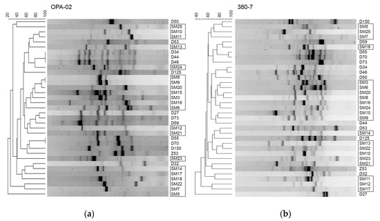 For the RAPD assay, DNA amplification was performed at the same time on the same thermocycler in a final reaction volume of 25 µL, containing 2.5 µL of 10× polymerase reaction buffer with KCl: 0.5 µL 10 mM dNTP, 1.25 µL 50 mM MgCl2, 2 µL 10 pmol/µL OPA-02 or 380-7 primer, 0.15 µL DreamTaq polymerase, and 5 µL of bacteria lysate.