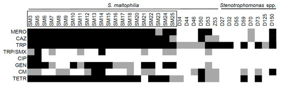 The resistance to antibiotics of Stenotrophomonas spp. of clinical and environmental origin. The isolates with names bracketed in black rectangles were isolated from clinical sources. Black squares indicate resistance; grey squares indicate intermediate resistance to antibiotic. The antibiotics are as indicated: meropenem (MERO), ceftazidime (CAZ), trimethoprime (TRP), trimethoprime-sulfametoxazole (TRP/SMX), ciprofloxacine (CIP), gentamicine (GEN), chloramphenicol (CM), and tetracyclin (TETR).