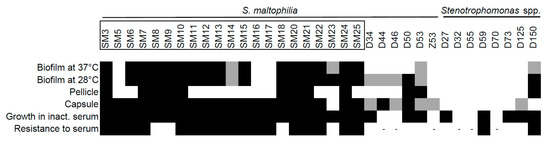 Biofilm formation and capsule-related characteristics of Stenotrophomonas spp. isolates. The biofilm, pellicle, capsule-forming phenotype, growth in inactivated serum and resistance to serum were determined as described in the Material and Methods section. The isolates with names bracketed in black rectangles were isolated from clinical sources. Black squares indicate the ability to form biofilm, pellicle, the presence of capsular polysaccharides (CPS), or the ability to grow in serum; grey squares indicate the ability to form weak biofilms or weak capsule-forming phenotype. “-” indicates that the isolates were not exposed to non-inactivated serum due to their inability to survive in inactivated serum.