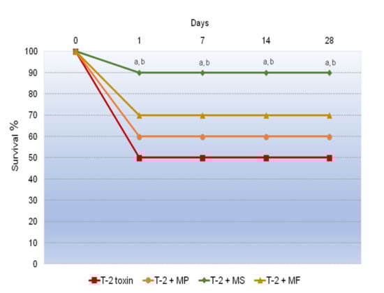 Time-dependent effects of Minazel-Plus® (MP), Mycosorb® (MS), and Mycofix-plus® (MF) on the survival rates in T-2 toxin-treated rats: (a) p < 0.05 vs. Minazel-Plus® (MP); (b) p < 0.05 vs. Mycofix-plus®.