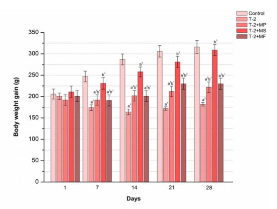 According to the data presented in Figure 2, the T-2 toxin induced a huge reduction in body weight compared with the control groups, with the lowest data being shown on the seventh day of this experiment (p < 0.001). Moreover, a mild increase in weight gain was registered from days 14 to 28, but it was significantly less than within the groups protected with Mycosorb® (p < 0.001), Minazel-Plus®, and Mycofix-plus® (p < 0.01). The best body weight was accomplished with Mycosorb®, and with values almost the same as for the control animals and notably above than those within the T-2 toxin-poisoned group (p < 0.001). Furthermore, a marked upgrowth of body mass was established within the Minazel-Plus®- and Mycofix-plus®-protected groups, with values significantly above those obtained within the unprotected group (p < 0.01). Moreover, body weight gain in these groups was significantly slower compared with the control group and Mycosorb®-treated group (p < 0.05).