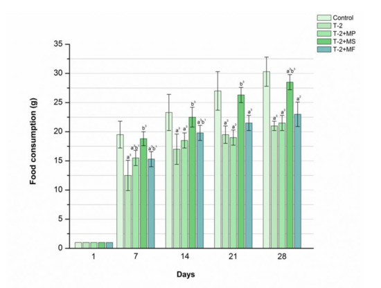 As presented in Figure 3, in the group of rats treated with only the T-2 toxin, a major reduction in food consumption was noticed one week after intoxication. Afterwards, a humble increase in food consumption was registered throughout the study period, with values significantly less than those for the control group (p < 0.001). On the contrary, the calculated values of food consumption in rats protected with Mycosorb® were very almost the same as those within the control group of rats throughout the trial (p < 0.001). However, in the Minazel-Plus®- and Mycofix-plus®-treated group, a moderate increase in food consumption was registered during days 7 to 14; however, their values were slightly above those from the poisoned group of animals (p < 0.05). Hence, in these two experimental groups, by the end of the study, food consumption was almost the same in the T-2 toxin-treated groups.