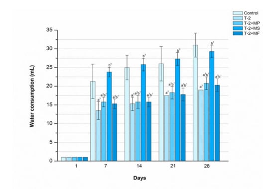 On the other hand, organic adsorbents like Mycosorb® have consequently been recommended as an alternative solution to adsorb numerous mycotoxins, including the T-2 toxin, but without spoiling the nutrient bioavailability or inducing adverse health effects in animals [56]. In agreement with other researchers, we observed [34,37,42,44] a significant lowering of the rats’ body weight and food and water consumption from the first week after the application of T-2 toxin. Although the body mass and food and water consumption of the Minazel-Plus®- and Mycofix-plus®-treated rats were also markedly decreased in comparison with the control animals, it was still greater than in the group treated with the T-2 toxin only, especially during the last three weeks of the trial. When a relatively high single dose of the T-2 toxin was administered, a significant decrease in body weight and food and water consumption was observed compared with the control group [19,44]. This could be explained by the loss of appetite, complete feed refusal, and substantial lesions in the tunica mucosa of the gastrointestinal tract accompanied by prolonged bloody diarrhea, which prevented food and water intake and its utilization [45,54,55].