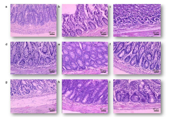Gastric micrographs of rats treated with the T-2 toxin (T-2) and protected with Minazel-Plus® (MP), Mycosorb® (MS), and Mycofix-plus® (MF); H&E staining, magnification 200×, scale bar = 50 µm: (a) control group, a gastric wall with no visible damage; (b) 7 days after treatment with T-2, ulceration in the lamina epithelial; (c) 28 days after treatment with T-2; cystic deformation of the gastric glands; (d) 7 days after treatment with T-2 + MP, erosions in the superficial epithelium; (e) 7 days after treatment with T-2 + MS, hyperemia and transmural oedema; (f) 7 days after treatment with T-2 + MF, degeneration of the epithelial and glandular cells; (g) 28 days after treatment with T-2 + MP, partial atrophy of the gastric pits; (h) 28 days after treatment with T-2 + MS, enlarged gastric pits; (i) 28 days after treatment with T-2 + MF, squamous degeneration of the epithelial cells.