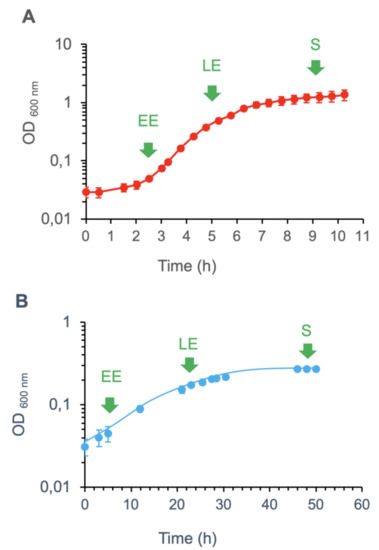 B. cereus AH187 (F4872/10) was grown in MOD medium supplemented with 30 mM glucose and buffered at pH 7. Cultures were grown at 30 °C or 16 °C under continuous shaking (200 rpm). MOD medium (200 mL in 2 L Erlenmeyer flasks) was inoculated at an OD600 of 0.02 from overnight precultures. Samples (50 mL) were collected at early exponential (EE), late exponential (LE), and stationary (S) growth phases, as indicated in Figure 1. Protein extracts were prepared from cell pellets and culture supernatants as previously described [50,51]. Protein samples were loaded onto NuPAGE Bis–Tris 4–12% gels (Invitrogen) for a short 5 min migration at 200 V [52], and then digested in-gel with mass spectrometry grade Trypsin Gold (Promega) in the presence of 0.01% ProteaseMAX surfactant (Promega). Triplicate samples were prepared for each culture condition.