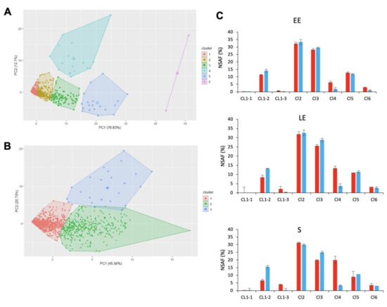Hierarchical clustering on principal components (HCPC) for B. cereus cellular proteins. (A) Principal component (PC) analysis of 30 °C- and 16 °C-proteomes for B. cereus cells harvested at early exponential (EE), late exponential (LE), and stationary (S) growth phases. Proteins are represented by colored marks and are plotted as a function of their PC1 and PC2 values. The colors applied to proteins were based on HCPC clustering, which produced a total of six clusters. (B) HCPC sub-clustering of proteins in cluster 1. The three subclusters are distinguished by color, and the proteins were plotted as a function of their PC1 and PC2 values. (C) Protein abundance levels (% NASF) associated with each cluster (CL) for EE, LE, and S growth phases at 30 °C (red) and 16 °C (blue). Values correspond to mean ± SD for three biological replicates.