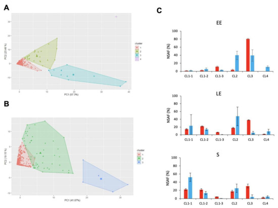 Hierarchical clustering of B. cereus extracellular proteins. (A) Principal component (PC) analysis of 30 °C and 16 °C-exoproteomes for B. cereus cells harvested at early exponential (EE), late exponential (LE), and stationary (S) growth phases. Individual exoproteins are represented by colored marks and are plotted as a function of their PC1 and PC2 values. Proteins were colored based on HCPC clustering, which produced four clusters, as shown. (B) HCPC sub-clustering of cluster 1. The three subclusters were attributed distinguishing colors, and the proteins are plotted as a function of their PC1 and PC2 values. (C) Exoprotein abundance levels (% NASF) associated with each cluster (CL) at EE, LE, and S growth phases at 30 °C (red) and 16 °C (blue). Values correspond to mean ± SD for three biological replicates.