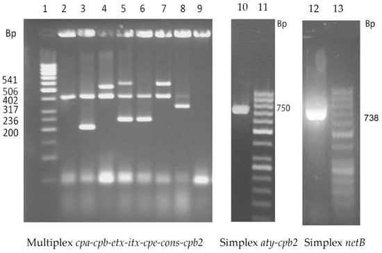 Fragment patterns by multiplex PCR assays of representative reference strains of Clostridium perfringens. Multiplex PCR: 50 bp ladder are reported on the left. Lines 1–8: Clostridium perfringens strains: ATCC 13124 (type A), KF190/06 (type A-consensus CPB2), ATCC 12917 (type F old A-CPE), NCTC 6121 (type B), NCTC 3180 (type C), NCTC 8346 (type D), NTCT 8084 (type E). Line 9: Clostridium sordellii ATCC 9714 (negative control). Simplex PCRs Lane 10: FDP82/04 (type A-atypical CPB2), Lane 11: 50 bp ladder, Lane 12: strain LBV/18 (type G-netB), Lane13: 50 bp ladder.