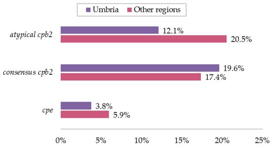 The presence of the cpe gene was about three times lower with respect to the other minor toxin genes in either geographic area (3.8% in Umbria region and 5.9% Other regions) (Figure 2).