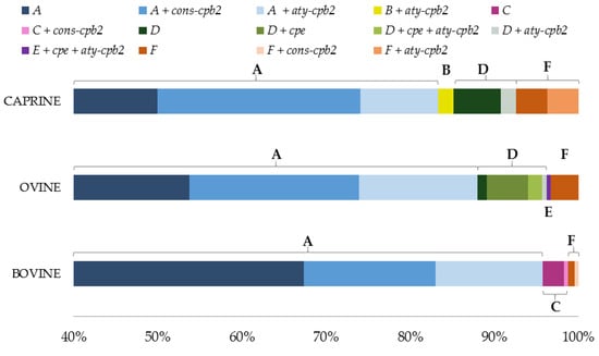 The toxinotypes distribution and the minor toxins genes were analyzed in bovine, ovine, and caprine species (the most represented animal species). The results are reported in Figure 3.