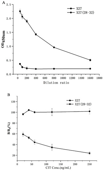 The wild-type amino acids 28–32 and 74 (the changes of the 74-site amino acid will affect the sensitivity of X27, data not shown) were individually alanine mutated, and the binding activity of the mutant was identified using phage-ELISA (its details were available in a previous step, and for the primers see Table 1). The CIT standard concentrations were 10, 20, 40, 80, and 120 ng/mL.