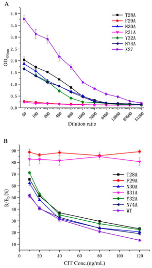 All phages (T28A, F29A, N30A, R31A, Y32A, N74A, and X27) were diluted to 1.2 × 1013 pfu/mL as the initial concentration to determine their binding activities to monoclonal antibodies and the competitive activity of the CIT standard through phage-ELISA. The binding activity of all mutants decreased compared with that of the wild-type X27 when the amino acids (28–32, and 74) were mutated to alanine. Furthermore, the mutants F29A and R31A decreased significantly and lost binding activity. The mutants T28A, N30A, Y32A, and N74A had about a 10-fold lower binding activity than the wild-type X27. (Figure 4A). This finding suggests that the amino acids at positions 28–31 and 74 in mimotope X27 are involved in the binding activity, among which the amino acids 29 and 31 play a vital role. In addition, we performed indirect competitive ELISA experiments on X27 and its mutants with different concentrations of CIT standards. The competitive activity of the X27 mutants (T28A, N30A, Y32A, and N74A) to CIT decreased with increasing CIT standard concentrations, but the mutants F29A and R31A showed no obvious change (Figure 4B).