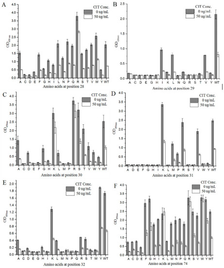 We designed degenerate primers to conduct site-directed saturation mutation experiments on mimotope X27 (28–32 and 74). Using M13R and pHEN-R as the specific primers, a single target fragment was successfully amplified with the correct band size (data not shown). All clones inserted the target fragment. Sixty positive clones were selected from each group (T28, F29, N30, R31, Y32, and N74) and sent for sequencing. The sequencing results were grouped at different positions (28–32- and 74-site amino acids), and the sequences of each group were compared using DNASTAR software. As a result, 18 different amino acids were introduced at each position on average. The X27 phage was appropriately diluted, so that the OD450 nm of the indirect competitive ELISA was around 2.0, and the X27 phage titer was 2.4 × 1011 pfu/mL. All the cloned phages to be identified were diluted with the above X27 phage titer of 2.4 × 1011 pfu/mL to perform the indirect competitive ELISA. When the six sites (28–32- and 74-site amino acids) were mutated to other amino acids, the affinity and sensitivity of the phage changed differently (Figure 5). When the amino acids at positions 29 and 32 were mutated, the mutants mostly showed a weakened affinity and sensitivity, indicating that the two sites played a key role in the specific binding of mimotope X27 and anti-CIT MAb. At position 31, the K mutation shows a better affinity compared to the WT, but R31K showed lower inhibition rates than the WT(R). Therefore, the amino acid at position 31 is also considered to be the key binding site.