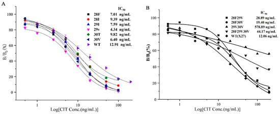 Combining the affinity and sensitivity of the antibody to determine the optimal clones (Figure 5), we selected the six optimal clones (T28F, T28I, F29I, F29V, N30T, and N30V) based on the site-saturated mutation experiment, and prepared the CIT indirect competitive ELISA standard curve. The IC50 values of the six mutations and wild-type X27 were compared. The IC50 values of the six mutants were lower than that of wild-type X27. The IC50 values of the T28F, T28I, F29I, F29V, N30T, and N30V mutants reached 7.01, 9.39, 7.59, 4.34, 9.82, and 6.40 ng/mL, respectively. The sensitivity of the F29V mutant was 2.96 times higher than that of the wild-type X27 (12.92 ng/mL) (Figure 6A).