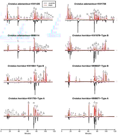 High performance liquid chromatography (HPLC) profiles of C. adamanteus (n = 3) and C. horridus (n = 5) venom samples at 220 nm. The black line reflected into the negative absorbance range shows the profile for the first sample taken as a juvenile, while the red line shows the last sample taken as a large adult. An asterisk indicates significant ontogenetic variation (p < 0.05). Peak height corresponds to absorbance at 220 nm, but heights were scaled to max peak height = 1 and absorbance not shown for simplicity.