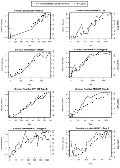 Mode and tempo of venom ontogeny. Line graphs show the change in both venom composition (as Aitchison distance from initial samples) and snout-to-vent length over time for all eight snakes studied. Open circles show venom Aitchison distance from early juvenile average, while filled circles show contemporaneous body size (SVL).