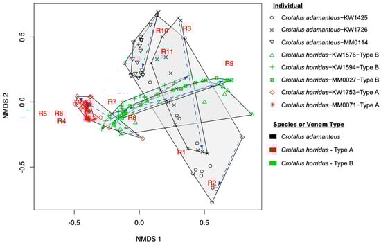 Non-metric multidimensional scaling of venom phenotypes binned into eleven retention time blocks (R1–R11) to allow comparison across all individuals and samples. Polygons are minimum convex shapes enclosing all samples from a single individual snake. Blue dashed arrows point from the earliest sample taken to the last for each individual. HPLC retention time window centroids are also plotted on the chart to clarify the relative position of the samples in venom space. The retention time windows used are as follows for each region designation: R1 (10–20 min), R2 (20–30 min), R3 (30–40 min), R4 (40–50 min), R5 (50–60 min), R6 (60–70 min), R7 (70–80 min), R98 (80–90 min), R9 (90–100 min), R10 (100–110 min), and R11 (110–125 min).