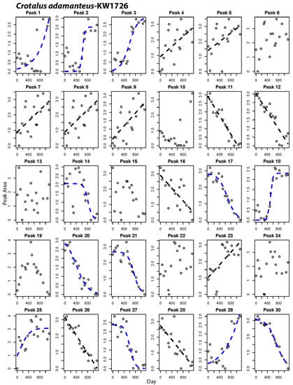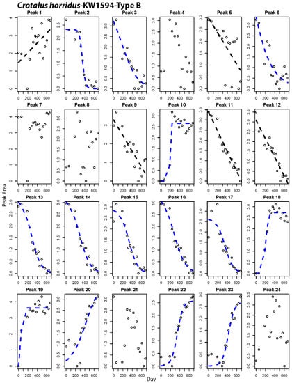 Margres et al. [41] discussed the compositional (simplex) nature of the venom phenotype extensively, pointing out that a rise in relative abundance of one protein in the venom necessitates a drop in abundance for other proteins. Within the framework of compositional data, it is important to remember that the shifts in relative abundance we see do not necessitate variation in transcription or translation of a protein across an animal’s life span. Instead, major up- or down-regulation of other venom genes can change the relative abundance of other proteins in a compositional phenotype such as venom. In other words, a relationship between time and peak relative abundance like that for KW1594 peak 11 (Figure 4; containing VEGF and NGF) can be the result of two distinct processes. First, the action of cis- or trans-regulatory mechanisms may be slowly reducing transcription over time in one or both of these genes, as post-transcriptional regulation of expression is not a large contributor to venom variation [42], leading to decreased production of this peak relative to other peaks that are produced at a constant rate. Alternatively, the reverse can be true, where upregulation of other genes via gene regulatory mechanisms is leading to a slow depression in relative abundance of these proteins in the venom, despite constant transcription and translation. It may be that those peaks displaying the steepest slopes, such as KW1594 peak 22 (Figure 4) are the most likely candidates to be targets of regulatory mechanisms over the course of development. Studies combining transcriptomics and proteomics with novel tools to study gene regulation are forthcoming in snake venomics [43,44] and will shed light on the proportion of venom that is directly regulated vs. impacted in a relative manner by changes in other venom components. More broadly, the presence of ontogenetic shifts in peak abundance that vary from highly linear to highly discrete and sigmoidal in shape suggests that alternate regulatory mechanisms are at play among the genes contributing to the same predatory phenotype of venom. Our work here therefore indicates that venom provides ostensible targets for studies of different gene regulatory mechanisms operating within a common functional module.