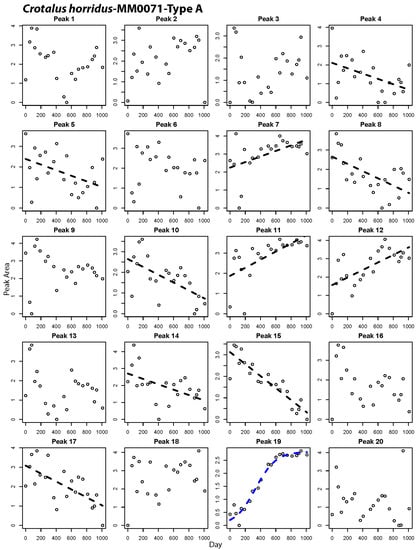Peak-by-peak analysis of relative abundance shifts over time for a Type A Crotalus horridus. Panels with best fit lines indicate peaks that changed significantly in abundance over time. Black lines indicate best fit of a linear model to the data, while blue lines show cases where a non-linear fit was best.
