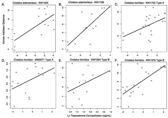 Our results do not meet the prediction of a strong linear relationship between the change in venom composition and the testosterone concentration across the course of our study (Figure 7), and a high correlation between body size and testosterone violates the assumption of a lack of multicollinearity in predictors, preventing us from conducting informative multiple regression analysis with both body size and testosterone level in the models. The change in venom composition and ln-testosterone concentration were significantly correlated in four of the six snakes for which testosterone was assayed (KW1425: R2 = 43%, p = 0.01; KW1576: R2 = 55%, p = 0.0003; KW1753: R2 = 18%, p = 0.04; KW1726: R2 = 62%, p = 0.001; MM0071: R2 = 23%, p = 0.07; KW1594: R2 = 15%, p = 0.18). These significant correlations underscore the patterns of maturation in both these snake species, where both testosterone concentrations and venom distance from the juvenile venom phenotype increase as snakes mature. We expected both venom to change and testosterone to increase into adulthood, as ontogenetic changes in venom composition are known from both species studied [18], and testosterone is known to increase with body size in snakes [39,40,45] as it mediates sexual maturity in rattlesnakes in both sexes [46]. As a result, a correlative study like ours required a specific prediction of a very strong relationship. Anything but a very strong linear relationship can be explained by other factors. Clearly, Figure 7 shows that the samples taken during periods of high testosterone are also samples that have changed in venom composition from the earliest sampling periods. However, the range in Aitchison distances associated with moderate to high testosterone levels spans nearly the full spectrum of the ontogenetic shift in venom. While seasonal testosterone shifts are known from adult rattlesnakes [46,47,48,49,50], there is little information on seasonal testosterone in young, small individuals [39]. Therefore, we suspect that the patterns in Figure 7 are best explained by slow ontogenetic shifts in venom that clearly occur over the snakes’ lifespans (Figure 2) and that these are eventually accompanied by changes in testosterone as snakes reach a size of sexual maturity.