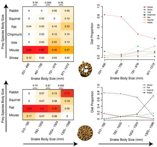 Size-structured dietary ecology in two rattlesnakes. Both Crotalus horridus (top) and Crotalus adamanteus (bottom) show ontogenetic shifts in the contribution of different mammalian prey items to their diet. Diet items from Clark et al. (2002) and Means et al. (2017) show differences among some body size quartiles. Data in cells are proportions of total diet (darker color = greater proportion), and values above each matrix are p-values for chi-squared tests for differences in counts of prey items between adjacent size class quartiles.