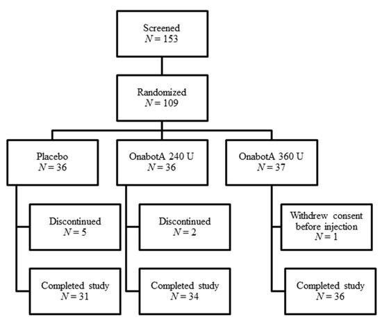 Study 1 was conducted between March 2000 and February 2001 at 12 sites in the United States, and Study 2 was conducted between November 2003 and August 2009 at 34 sites in the United States and European Union. Both were phase 2, prospective, placebo-controlled studies in which patients were randomized to placebo, 240 U, or 360 U onabotA. Institutional Review Board or Independent Ethics Committee approval was obtained at each study site prior to study initiation (Nos. 191622-030 and 191622-057-03; Date: 13 May 2003).