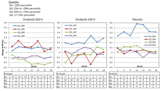 Similarly, in Study 2, no predictable pattern of FVC increases or decreases were discernible based on FVC quartile at baseline (Figure 6). In the 360 U group, FVC tended to slightly decrease regardless of baseline FVC values (note that week 19 is an exception and includes only the few patients who were reinjected at week 18; see N values in Figure 6). In the 240 U and placebo groups, FVC tended to slightly increase regardless of baseline FVC. Again, week 19 tended to be an exception and included very small numbers of patients.